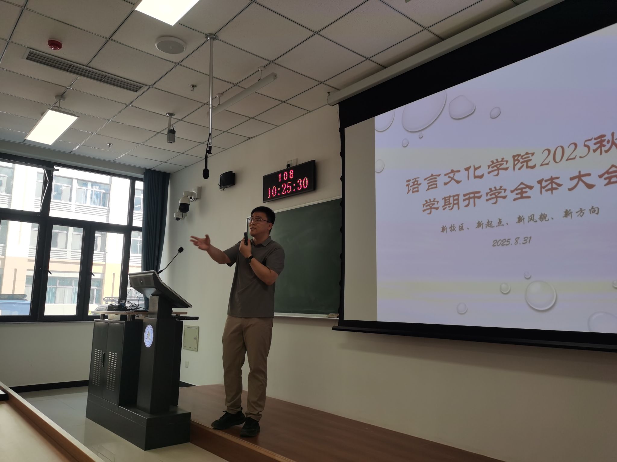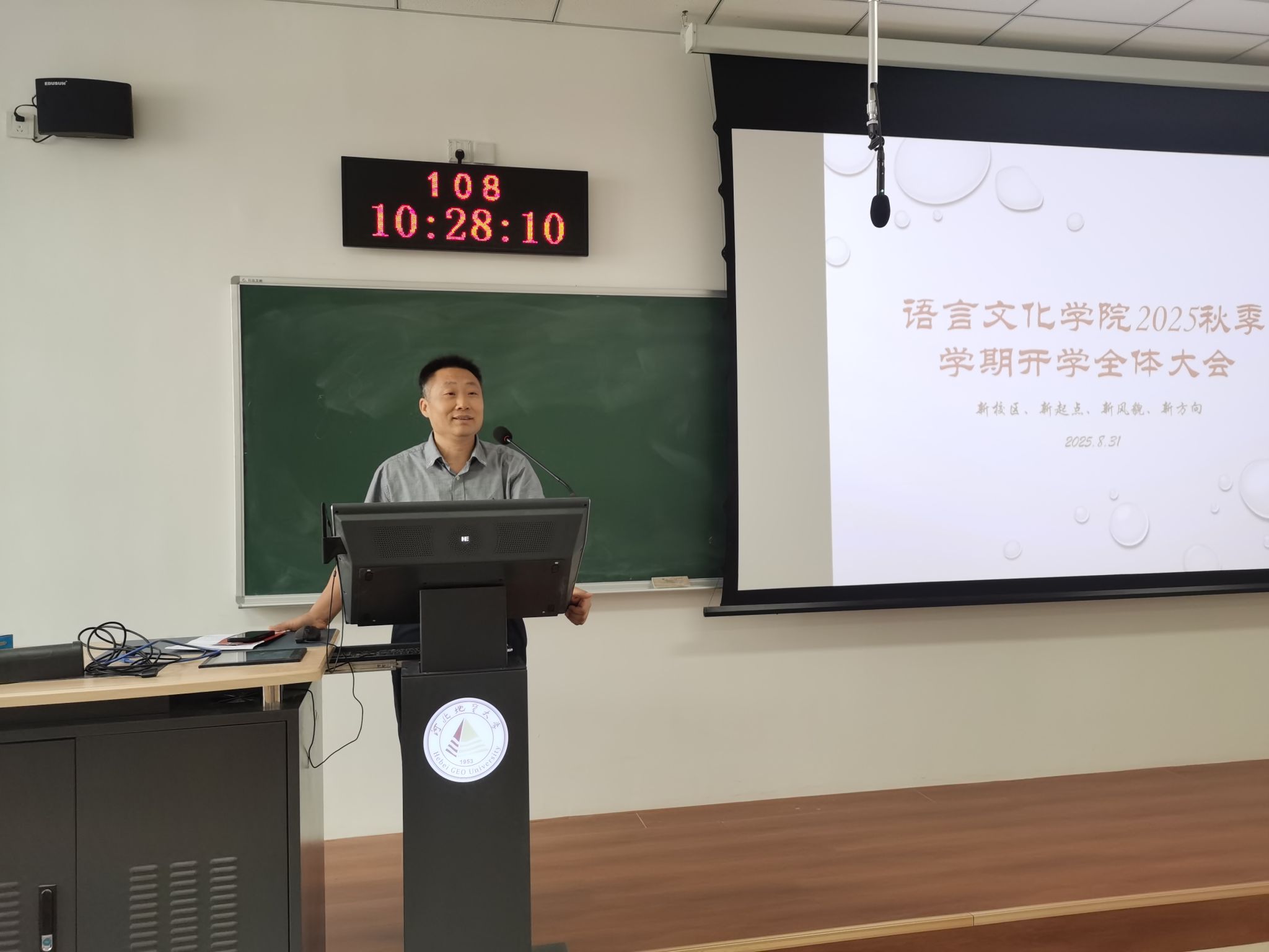 2025年8月31日上午9:30,语言文化学院在新校区教学1号楼108教室召开了2025年秋季学期开学学院全体大会。学院党委书记宋朝霞主持会议,院长付天军、院党委副书记杨旭辉、副院长李圣轩出席会议,学院全体教职工参加了会议。